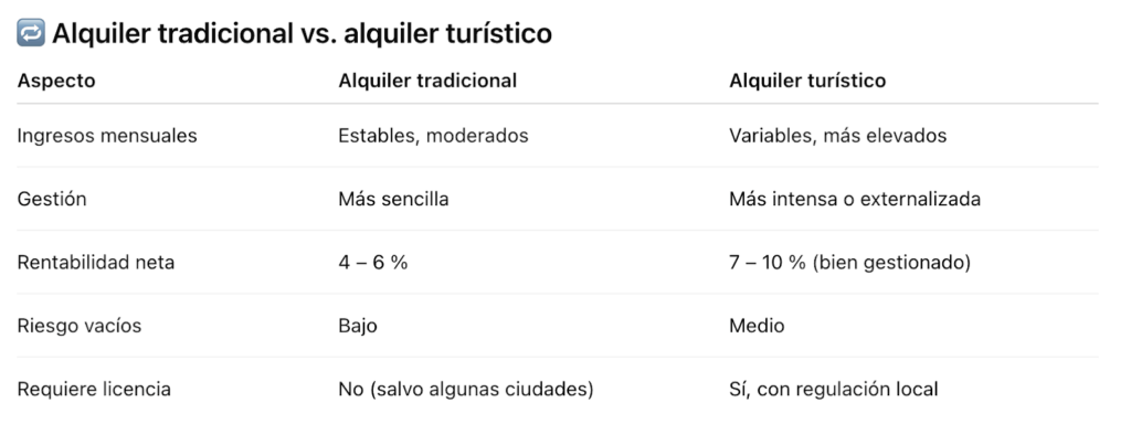 Apartamento reformado por 20.000 €, adquirido por 110.000 €. En turístico genera 1.800 €/mes en temporada alta, y unos 900 € en baja. Inversión total: 130.000 €. Rentabilidad neta anual: 8,5 %.