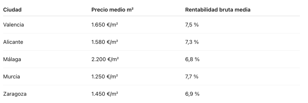 Aunque Madrid y Barcelona tienen demanda asegurada, los precios de entrada son más altos y reducen la rentabilidad neta. En cambio, hay ciudades de segunda línea con un binomio perfecto: precios accesibles + alta demanda de alquiler.